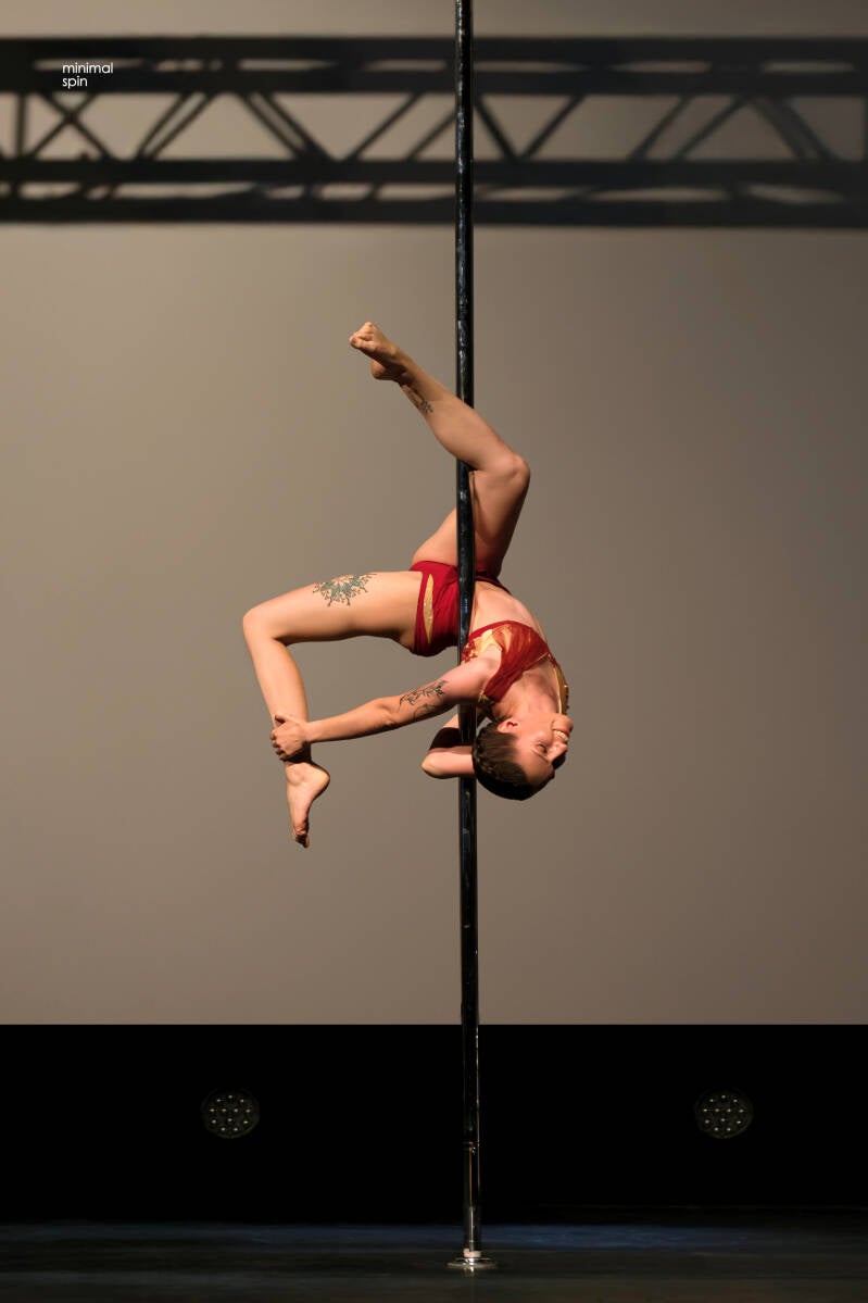 Amateur novice : si je peux m’inverser proprement du sol, mais pas sur ou en haut de la pole. Figures interdites : flips, lifts, ayesha et figures inversées avec moins de 3 points de contact. Figures 0,5 et moins du code de pointage.